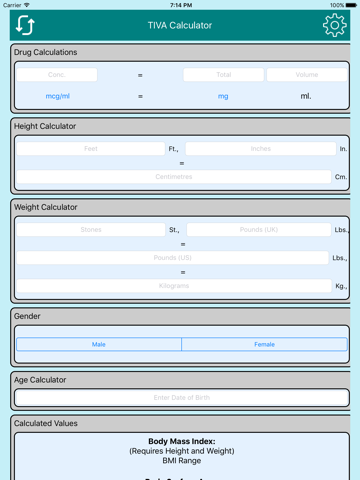 TIVA Calc is a quick and simple app to help you when you are using Total Intravenous Anaesthesia (TIVA), or setting up a ventilator in the operating theatre or critical care unit; or for that matter any calculation involving height, weight, body surface area or BMI.
