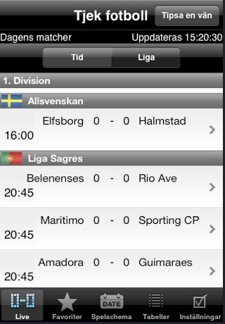 Under Schema kan du se matcherna för de kommande 7 dagarna, för de ligor som du valt under Inställningar.