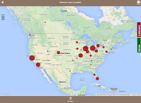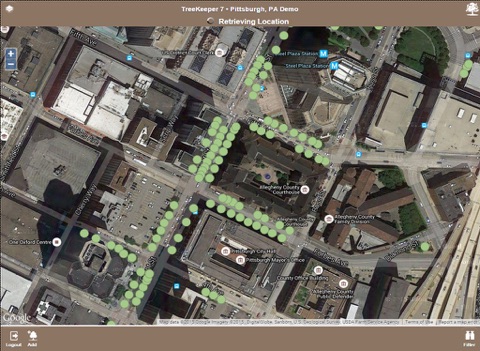 The mobile system utilizes the location services or GPS availability of the tablet computer to locate your position automatically on the map. Your position on the map appears as a red dot while nearby trees are marked with green dots. You can quickly identify a marker to see brief details on the tree site as well as bring up the full details of the site.