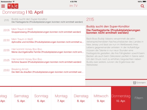 Ob CAKE BOSS, BREAKING AMISH oder ALLE MEINE FRAUEN - auf der App könnt ihr euch eine Auswahl der besten Folgen in voller Länge unterwegs anschauen - und das völlig kostenlos. Außerdem verpasst ihr mit der eingebauten Erinnerungsfunktion nie mehr eure TLC-Lieblingsserien und seid immer bestens über unser tägliches Programm informiert.