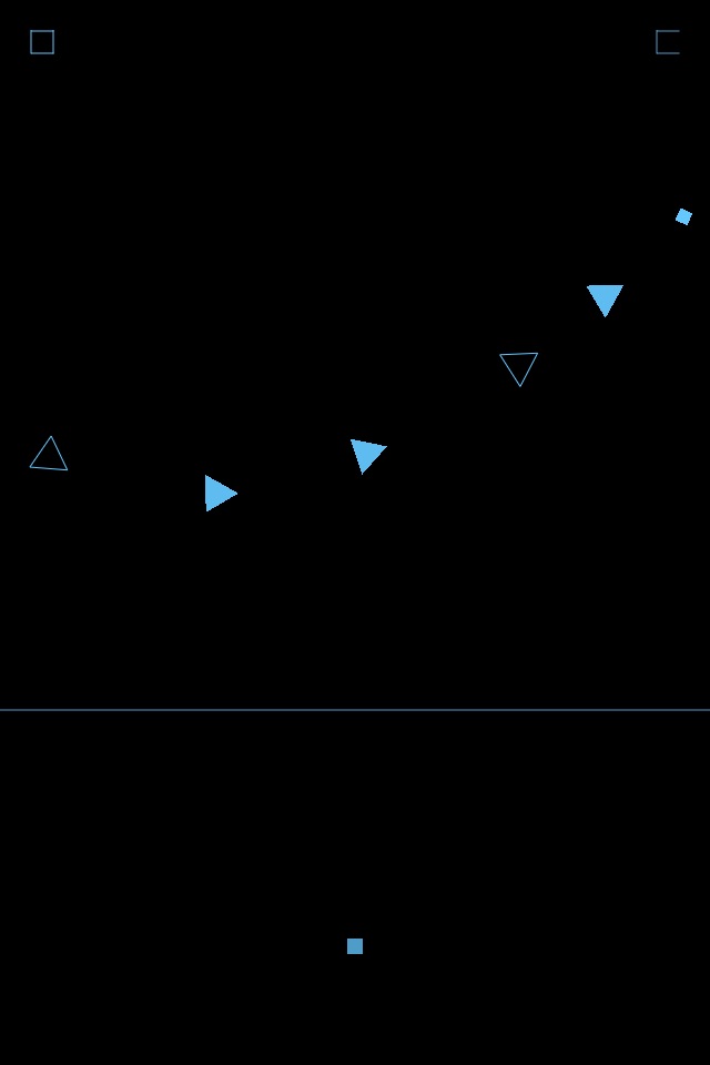 When a triangle hits a square, it toggles between outlined and filled shape. A round is complete when all triangles are filled. The game is over when all triangles are outlined.