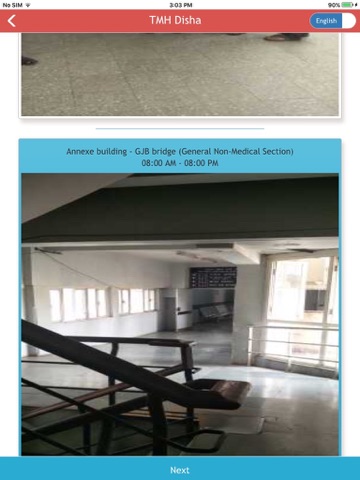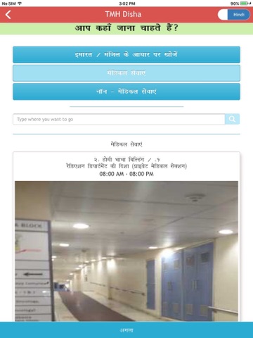 The applications Show Directions option allows the user to specify which department he wants to go by selecting the department name by Building/Floor, or Medical Services, or Non-Medical Services. Once selected, the patient is asked where he is right now. This is done by providing him with various hints using images of various sections and departments in Tata Memorial Hospital. Once selected, the application would guide the patient from his current location to the location where he wants to go by showing him images of the places where he should go. The Guide Me option shows him the image of the next location where he should go. If the patient follows the locations based on the pictures shown, he can easily navigate to the department he wants to reach.