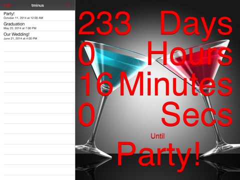Do you love the anticipation you feel when counting down the days to a big event? No matter what you are looking forward to, tminus will tell you exactly how long you have to wait. tminus is perfect for everything you are looking forward to, from big events to a Friday night out on the town: