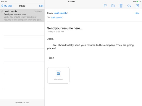 TNEFs Enough allows your iPhone, iPad or iPod Touch to read and extract files from Microsoft TNEF files. The files are usually received via email from Microsoft Exchange and Microsoft Outlook users. Standard e-mail programs will receive the TNEF file as an attachment named "winmail.dat."