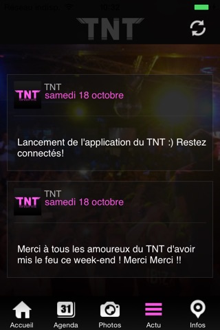 Application mobile de la discotheque Le TNT à Marmande, 2 salles, 2 djs, 4 bars, 2 terrasses.