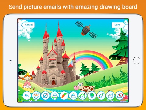 - Inside the intuitive email app, kids will have fun with an amazing drawing board with postcards, stamps, pen, brushes, and other instruments to draw attachments