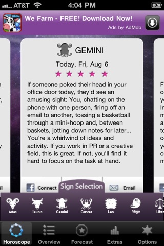 Today’s Horoscope by Kelli Fox is the easy way to check out horoscopes for all twelve star signs. You can delve deeper with the astrological Overview section and take a sneak peek at the week ahead with the Forecast section. All in a simple to use, free application for your iPhone. The “Extras” section provides free astrology reports, astrological matching, monthly horoscopes and more.