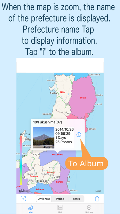 "List" photos, shooting date, number of shots, and number of days are displayed for each prefecture.