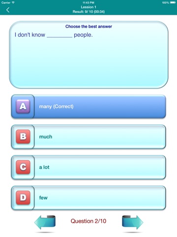 This app focus in structure base test, each test has ten questions, each question has four answers to choose. At the end of the test will assess your score achieved, then you can learn from experience and improve their abilities through each this lesson