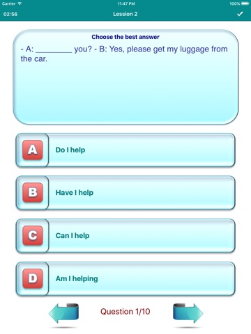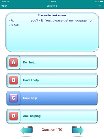 This app focus in structure base test, each test has ten questions, each question has four answers to choose. At the end of the test will assess your score achieved, then you can learn from experience and improve their abilities through each this lesson