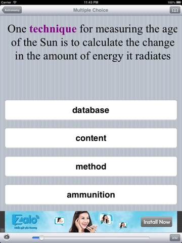In the multiple choice test, this application will give you sentences that you always see in the TOEFL test in which you have to choose the word or phrase closest in meaning to the highlighted part.