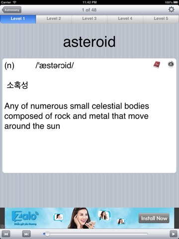 All words have audio and definition of English, Vietnam and Korea meaning. With the convenient ‚"Play" mode, you can just listen and learn, without having to look at the screen. Especially, three modes: easy, moderate, and tough will help you classify the words that you are well known, know a little, and dont know.