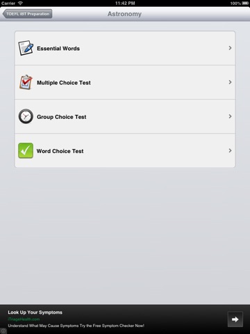TOEFL iBT Preparation is the best tool for improving your vocabulary over all covered areas of TOEFL Test with clearly and distinctly explained meaning. Moreover with this application, you can quickly accustom with multiple choice test, one of the most types in the TOEFL test.