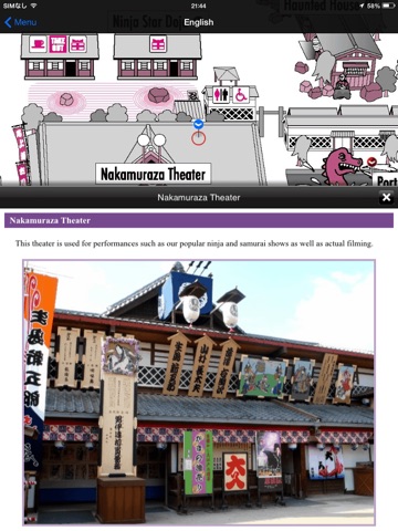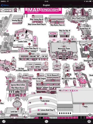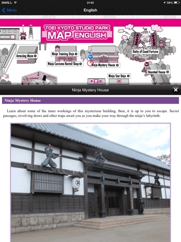 This guide is based on information that is distributed at the entrance of Toei Kyoto Studio Park. Facts and pictures of various attractions, facilities, film sets and other places marked can be displayed on the map.