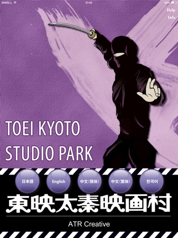 The Toei Kyoto Studio Park Guide will assist you as you make your way around the park, located in Ukyo ward, Kyoto city. In addition to seeing your current location, information on your surroundings can also be displayed. Five language options are available. Information is based on maps that can be found as a hard-copies in Japanese, English, Chinese, Taiwanese and Korean, at the entrance of the park.