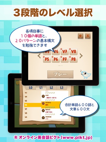 最終的にすべてのレベルを学習すれば、60パターン構文で合計600フレーズを練習できます。