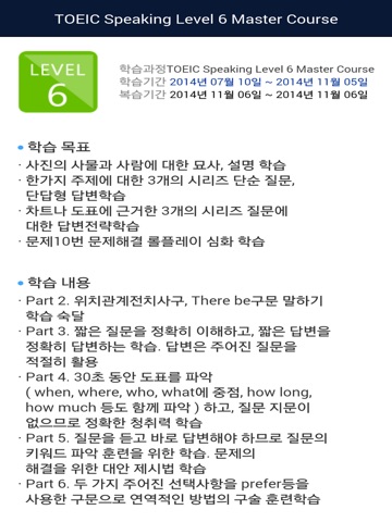 - TOEIC Speaking Level 6 Master Course는 기업 및 대학교 전용 앱입니다.