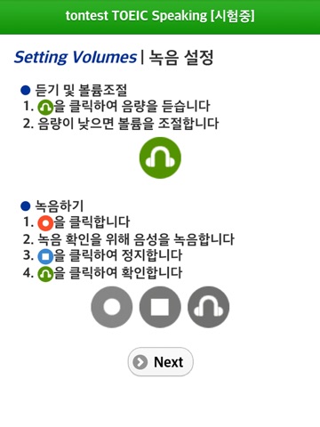 - 볼륨설정(듣기 및 녹음) -> Direction을 진행하시고 1~11문제의 시험을 진행합니다.
