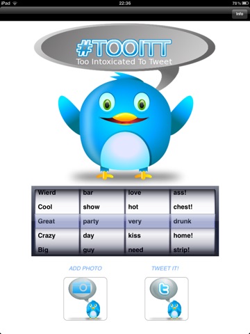 Too Intoxicated To Tweet? TOOITT! An app for everyone who has trouble tweeting whilst drinking, when your fingers wont type what your brain is thinking! Use the picker to create your sentence, attach a photo if you like, then tweet it directly from within the app!* So everyone doesnt think youve gone crazy #TOOITT automatically added to the end of your tweets so they can join in the fun! *Twitter account and internet connection required for this function.