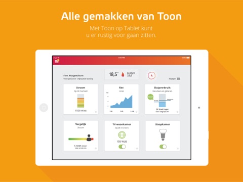Toon is de slimme thermostaat van Eneco. Om gebruik te maken van Toon op Tablet heeft u een geïnstalleerde Toon met een Toon-abonnement nodig. Door gebruik te maken van deze app accepteert u de nieuwe voorwaarden van de Toon Apps. U vindt deze op eneco.nl/voorwaarden.