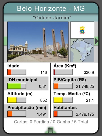 Neste jogo de cartas educativo, conheça as principais cidades Brasileiras, com belas fotos do Opção Brasil Imagens, e fichas informando seus dados estatísticos, frase e história. Você irá disputar cara-a-cara com outro jogador, cada um com seu smartphone, graças a tecnologia NearBytes. Você terá que ser esperto, e escolher a melhor característica de cada cidade Brasileira, para tentar ganhar todos as cartas do jogo.