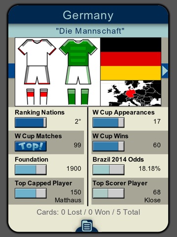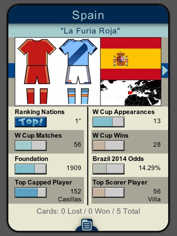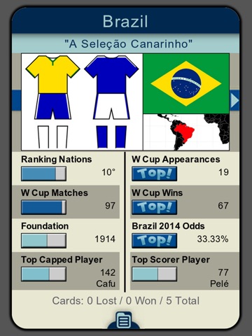 In this educational card game, discover amazing data about the 32 national soccer teams taking part of the 2014 soccer cup in Brazil. You`ll play face-to-face with another player, each one on his own smartphone, using NearBytes technology. You`ll have to be smart, and choose the best characteristic for each squad, in order to win all the cards in the game. Could you beat the Brazil card with the Iran card? Yes, if you use the right characteristic!