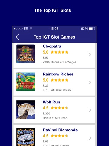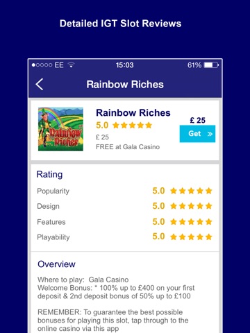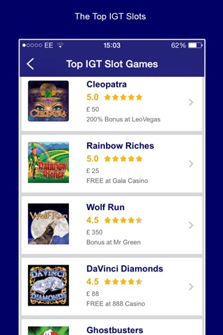If you are looking to find your favourite slot game, or just want to compare the creme da la creme of online slots, then Top IGT Slots is the app for you. Featured games include Rainbow Riches, Cleopatra Da Vinci Diamonds, Wolf Run, Golden Goddess, Ghostbusters & Kitty Glitter.