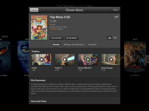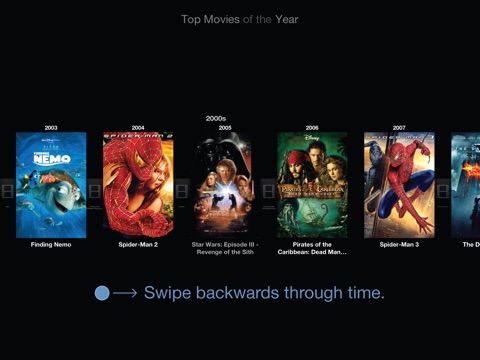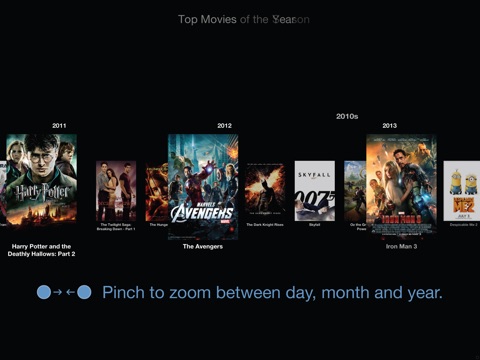 Top Movies is a zoomable timeline – a gestural interface that lets you control how many or few movies you want to see. Swipe to scroll back through time. Pinch to zoom between daily, monthly and yearly views. Tap for more details and download right from within the app!