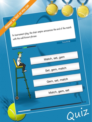 Lets test yourself in an fun and challenging tennis quiz game ! The questions are about tennis rules and latests news.