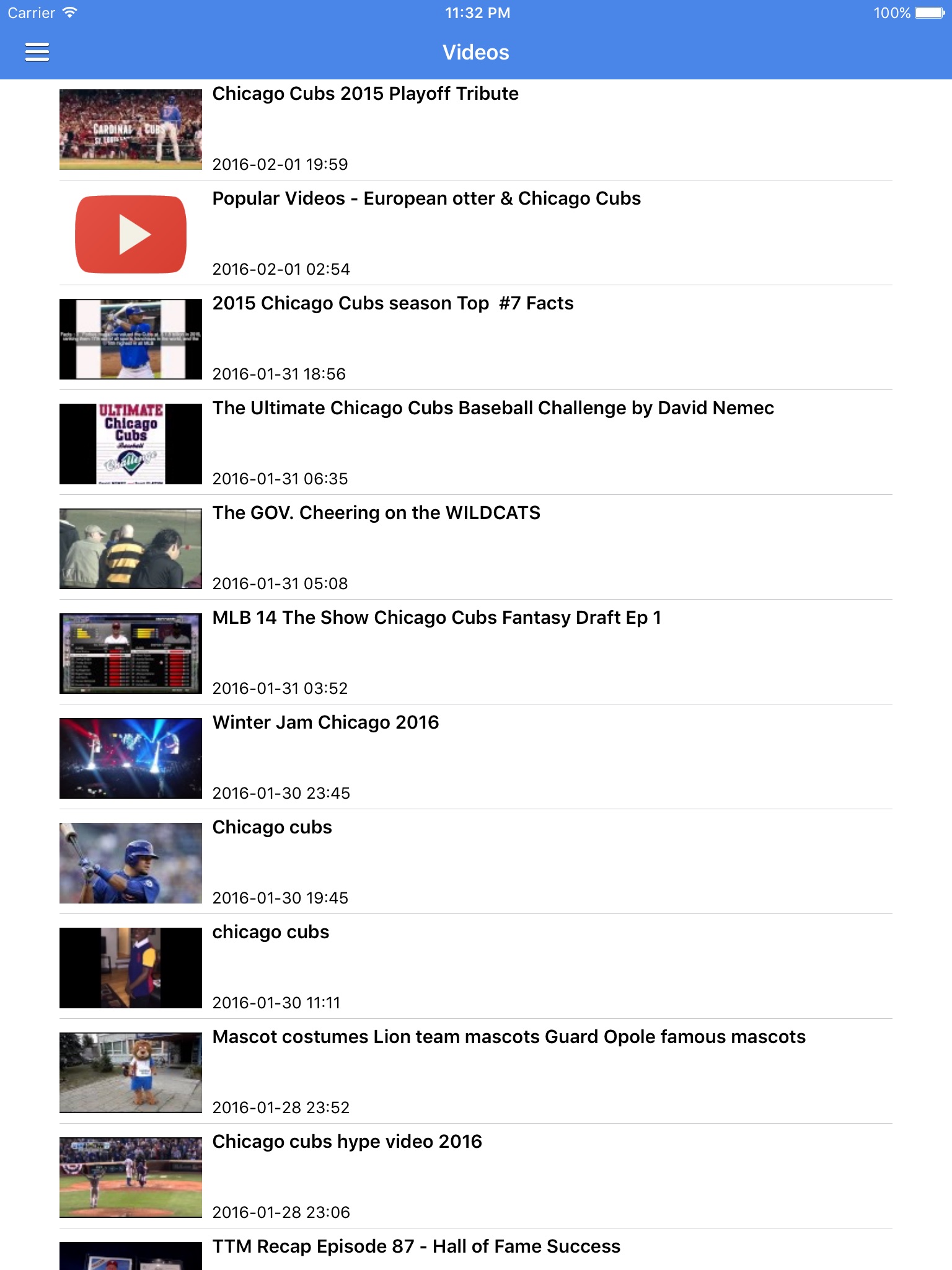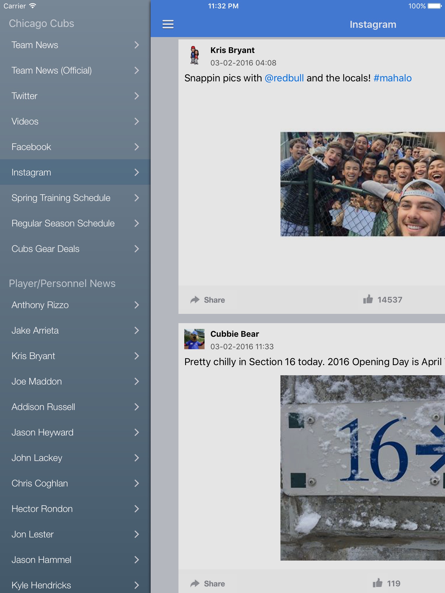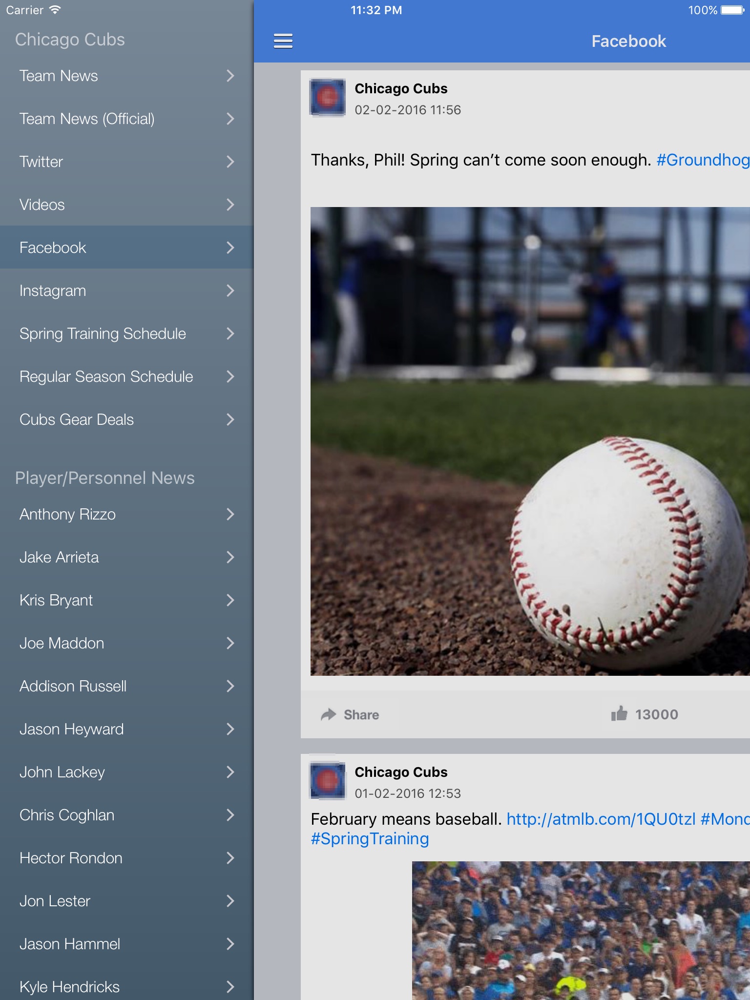 The News Surge Chicago Cubs News app is the best way for Chicago Cubs fans to get the latest news, rumors, videos, photos and more on the beloved Cubbies. Follow the current game or watch the highlights/recap. You can also easily get the latest info on stars Anthony Rizzo, Jake Arrieta, Kris Bryant, as well as up-and-coming young Cubs players from AAA or AA. Sources of news, rumors & multimedia include Twitter, Youtube, Facebook, and hundreds of websites. The app is always fresh, always updated.