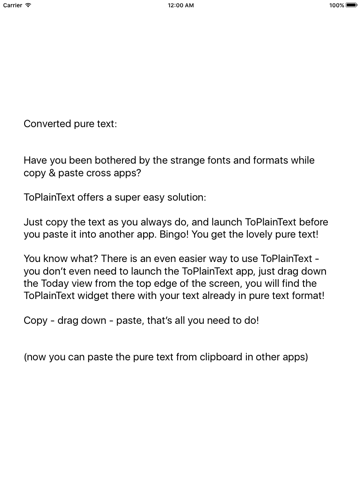 You know what? There is an even easier way to use ToPlainText - you don’t even need to launch the ToPlainText app, just drag down the Today view from the top edge of the screen, you will find the ToPlainText widget there with your text already in pure text format!