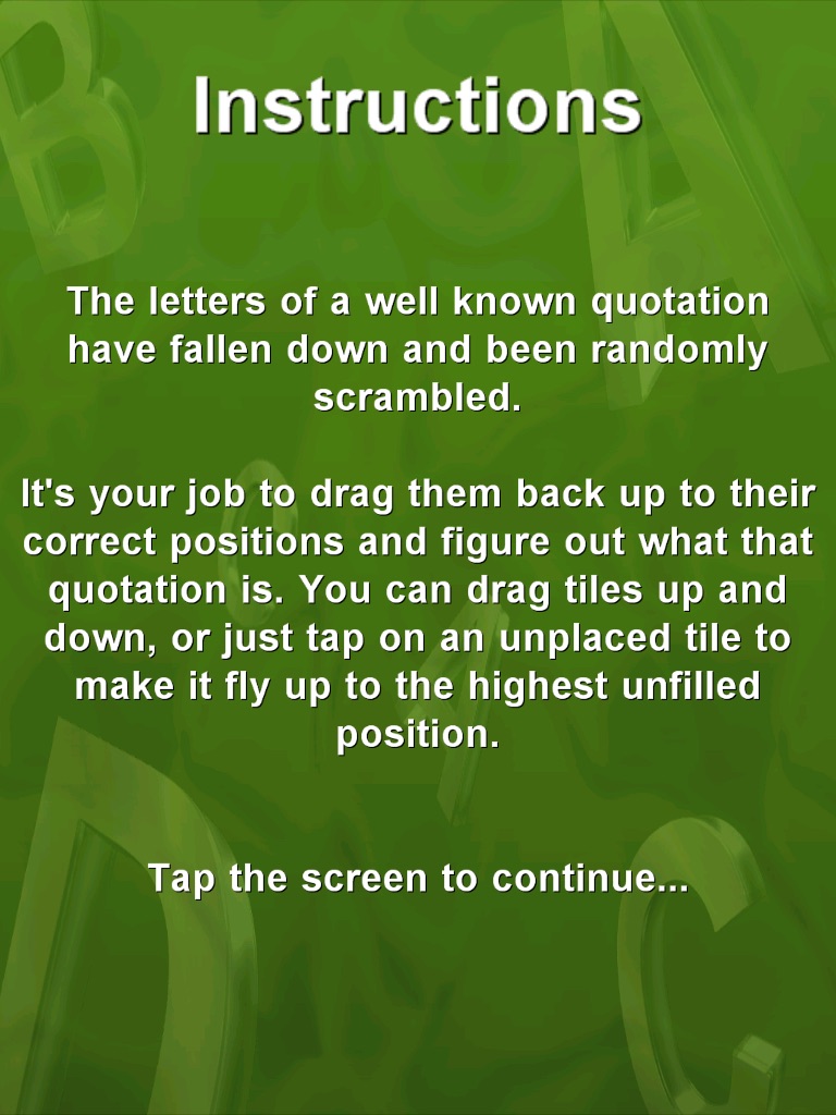 The letters of a joke have fallen down and been randomly scrambled. Its your job to drag them back up to their correct positions and figure out what that joke is. You can drag tiles up and down, or just tap on an unplaced tile to make it fly up to the highest unfilled position.