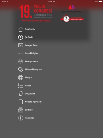 Toraks 2016 Mobil Uygulaması ile kongre öncesinde ve sırasında genel bilgilere, bilimsel program, konuşmacı bilgilerine ve detaylarına ulaşabilir, sunum ve bildiri bölümlerinden bildirilerin kısa detaylarını inceleyebilir izin verilen sunumları pdf olarak görebilirsiniz. Anlık bildirimler, duyurular ve favori bölümü ile oturumlardan, öğle ikramları gibi sosyal etkinliklerden haberdar olabilir, anket sistemimiz ile soruları cevaplayabilir, medya bölümümüzden kongre fotograflarını, videolarını takip edebilirsiniz.