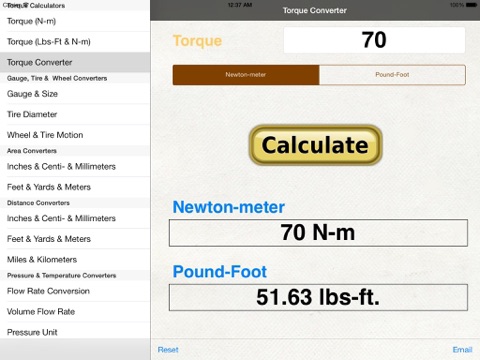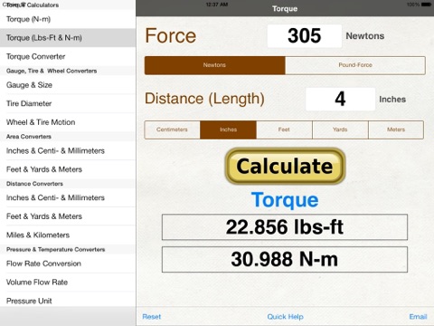 The Torque+ app is designed to supply information about the torque using Force and Distance, or Length, in put as Newton-meters, Foot-pounds, Inches, Feet, Yards, or Meters.