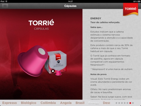 A app Torrié tem como objetivo disponibilizar aos consumidores mais informação sobre a Torrié e o seu café, ao mesmo tempo que procura promover uma vida mais saudável. Através de georreferência, a app Torrié indica locais próximos do posicionamento de cada utilizador para a prática de atividades desportivas e de bem-estar. Esta aplicação propõe receitas inovadoras que incluem o café como ingrediente e permite o acesso direto a imagens do apaixonante mundo do café na página da Torrié na rede social Pinterest.