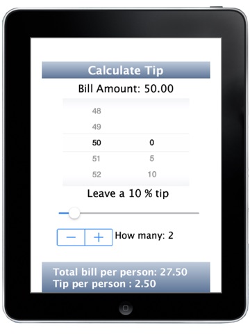 This application is useful to have on your iPphone. Very easy to use and comes in handy, especially when you share the bill at a restaurant. How much do we pay for the tip and how much does each person pay.