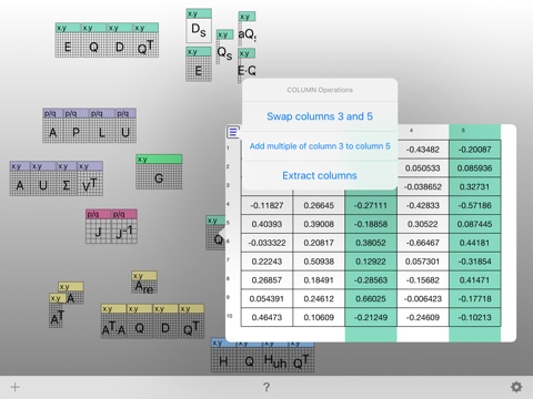 • sub matrix editing, elementary column operations (in addition to the existing row operations), drag-and-drop scalar multiplication (e.g. for verifying eigenvalue-eigenvector pairs), and a Frobenius norm computation to check the results of decompositions or compare matrices.
