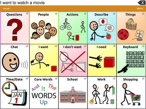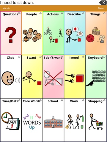 Vocabulary files within TouchChat are fully customizable, including pages, grid layout, buttons, messages, and symbols. Select from over 45 button actions and nearly 40,000 Symbolstix® symbols* when creating new buttons. You can also choose to use an existing image or take a photo with the built-in camera. Additionally, gestures can be used to navigate to new pages, speak messages, etc.