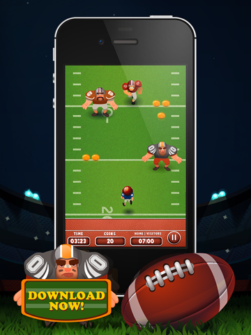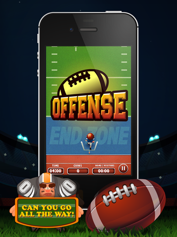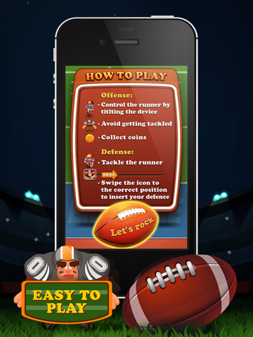 Control your offense by running down the field, tilting and moving your device to avoid really nasty looking tacklers and collect coins as you do. But watch out, its addictive. You will find yourself contorting and grunting and screaming, "Oh my God. Run. Run. Run!" while onlookers’ harrumph in disgust. Not recommended for play in church or in the doctor’s office waiting room. On defense you need to play smart, get in position to manipulate and slide a bunch of mean defensive guys in front of the evil ball carrier to stop him from scoring.