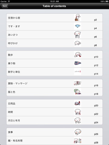 あいさつから食事・買い物・病気・トラブルまで、全23シーン、およそ1200の厳選フレーズ・単語が収録されています。詳細は下記の目次をご覧ください。