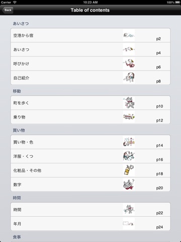 あいさつから食事・買い物・病気・トラブルまで、全22シーン、およそ1400の厳選フレーズ・単語が収録されています。詳細は下記の目次をご覧ください。