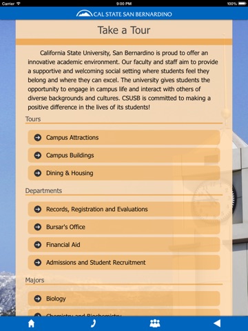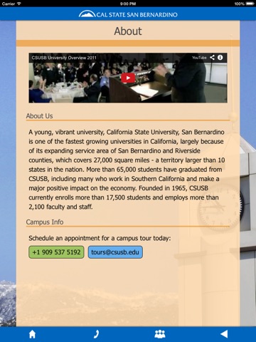 Cant make it to Cal State San Bernardino? Tour the CSUSB campus with your mobile device to learn about your future home as a Cal State San Bernardino Coyote. This self-guided tour app is rich with text, video and images for more than 50 locations around our campus. Its street-view enabled, so take some time to explore the highlights of CSUSB’s beautiful campus. Each stop features a general description and contact information for departments or offices housed within. Come Here, Go Anywhere!