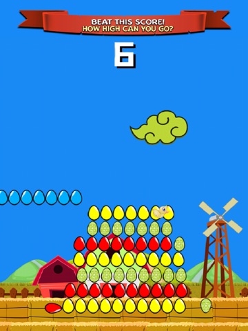 Tap the screen so the row of eggs stops. Be sure to line up with the previous row so that no eggs from the edge fall off. As you climb the tower of eggs, the next row gets smaller and smaller and the game play gets harder. If you dont line it up with the previous row, you lose more eggs. Once all your eggs fall off, game is over.