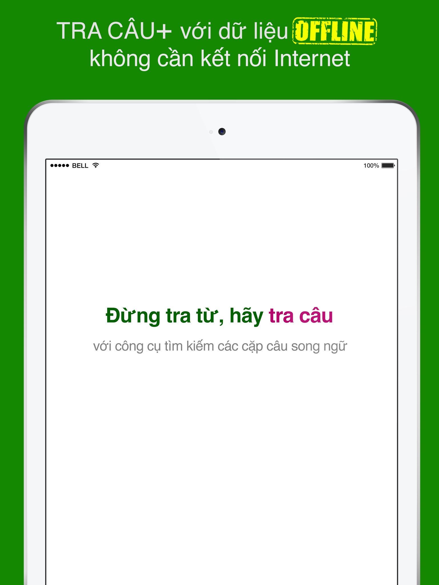 Tra câu + là phiên bản dữ liệu offline của Tra câu Việt - Anh, Anh - Việt. Với gần 1.5 triệu cặp câu được lưu trữ sẵn trong thiết bị, Tra câu+ sẽ giúp bạn có thể dễ dàng tìm kiếm câu tiếng Anh mình cần để đàm thoại, viết thư, viết tài liệu hay dịch thuật. Ứng dụng cho phép bạn tìm kiếm theo nghĩa Tiếng Việt (kể cả không dấu) và cả nghĩa Tiếng Anh.
