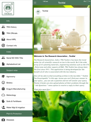 Tea Research Association, India ( TRA Tocklai ) has been the trend setter for all scientific research on tea in the world. Be it the wide array of its planting materials, engineering solutions such as the CTC , Rotorvane and other aspects of R&D, TRA Tocklai has always been the first since 1911. This application is also being developed for the benefit of all who is associated with the tea industry as well as those who like the wonder beverage called tea.