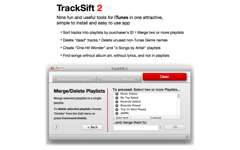 I installed TrackSift 2 in order to find some songs that were purchased by someone that is no longer living here at home and I couldn’t find which songs they were. This created a playlist for each apple account and it was easy to see what I needed. Even better than the program itself is Doug and the support he gives. When I first installed the app it didn’t do what I thought it should, but I contacted support and he troubleshot and found that I had a problem with itunes itself, but it didn’t end there, he stuck with me until we got that fixed. You just don’t find service like that.