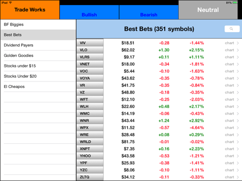 Trade Works contains a collection of stock filter scans that provide traders with lists of stocks that meet preset criteria. The filters return stocks from ETF scans, stocks trading under a certain price, dividend paying stocks and many others. Traders can chart a specific stock, toggle on/off a simple moving average of 14 bars and bring up an options chain if the stock of interest is optionable.