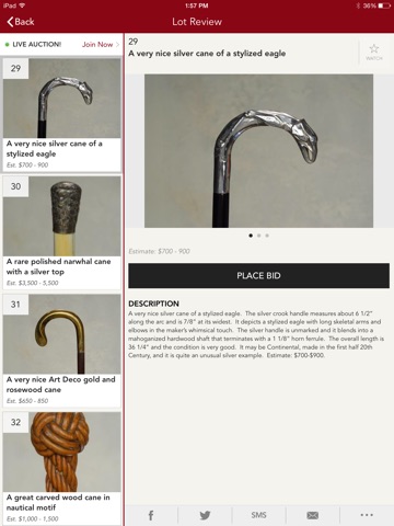 Place absentee and live bids on your favorite canes, browse upcoming and past auction catalogs, watch lots of interest, consign items and view catalogs quickly and conveniently from your mobile device or tablet.