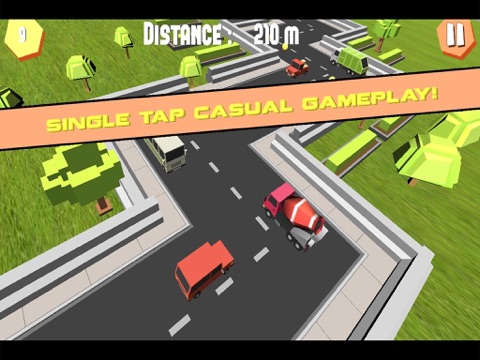 Tap the screen to change directions of the car. Avoid the toon traffic by pre-empting their path and collect money to upgrade your car and set the highest distance record or score!