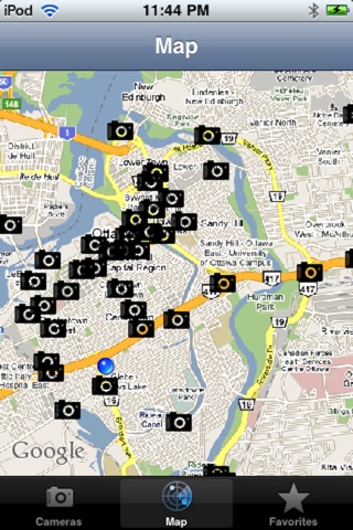 Traffic Ottawa displays the traffic cameras provided by the City of Ottawa and the Ontario Ministry of Transportation. Simply browse the list of intersections, or alternatively open the handy map displaying all the traffic cameras in the Ottawa/Gatineau area, and choose the camera to view.